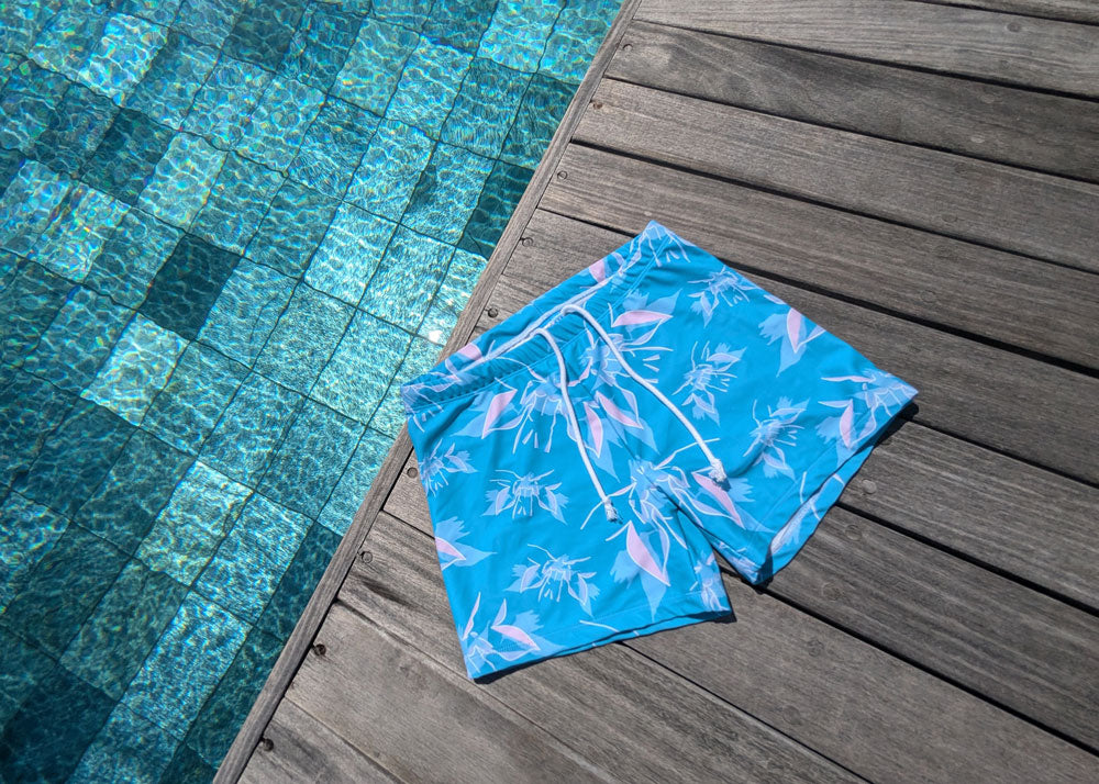 Angel print swim trunks in teal with pink accents made from form fitting, comfortable lycra. These swim trunks are: